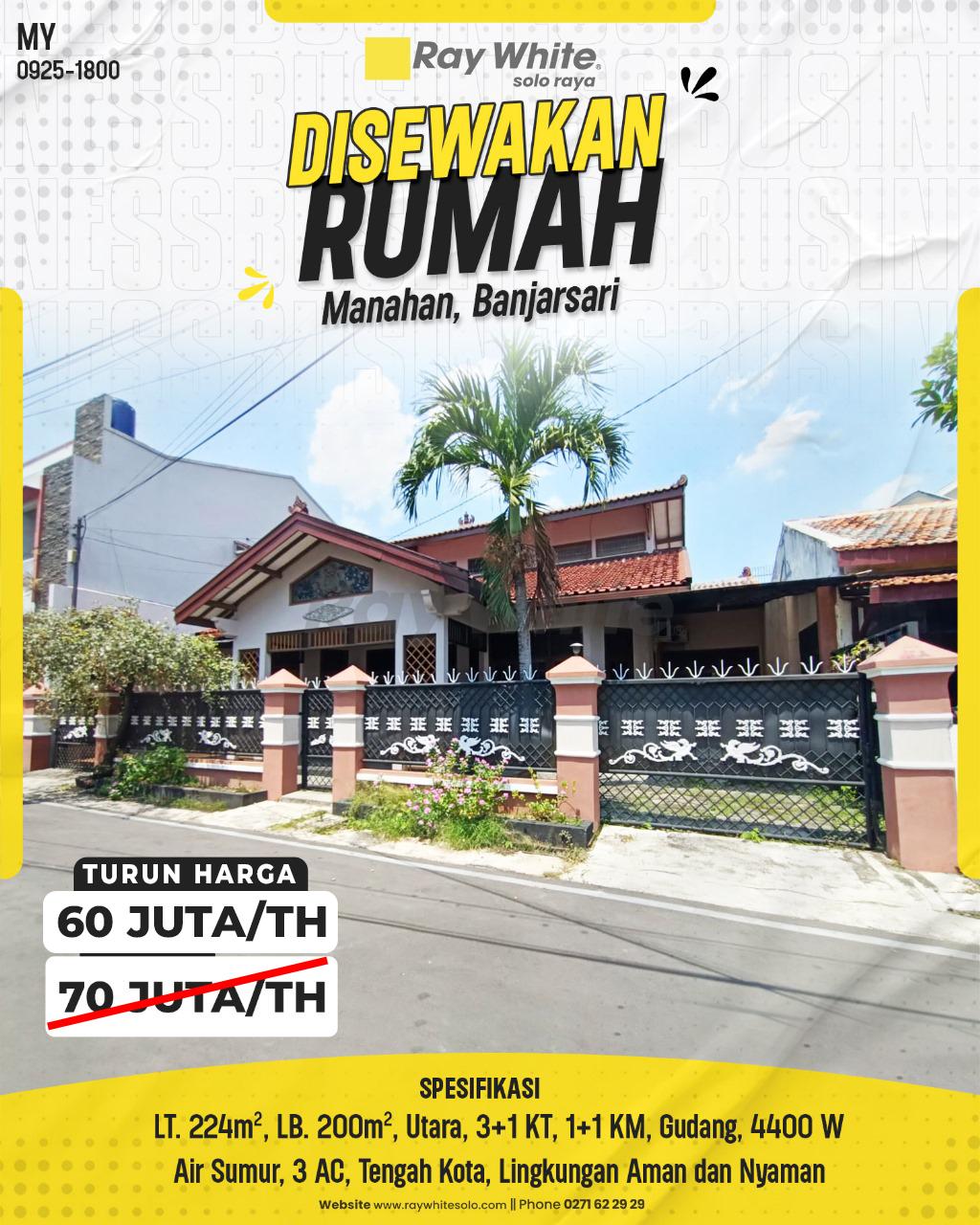 Nikmati kenyamanan tinggal di kawasan residensial paling favorit di Kota Solo. Disewakan sebuah rumah yang luas dan terawat di jantung Manahan. Dengan lingkungan yang terkenal aman, asri, dan tenang, properti ini menawarkan kualitas hidup terbaik untuk keluarga Anda. Lokasinya yang sangat strategis memastikan semua kebutuhan gaya hidup, pendidikan, dan bisnis Anda dapat dijangkau dalam hitungan menit.