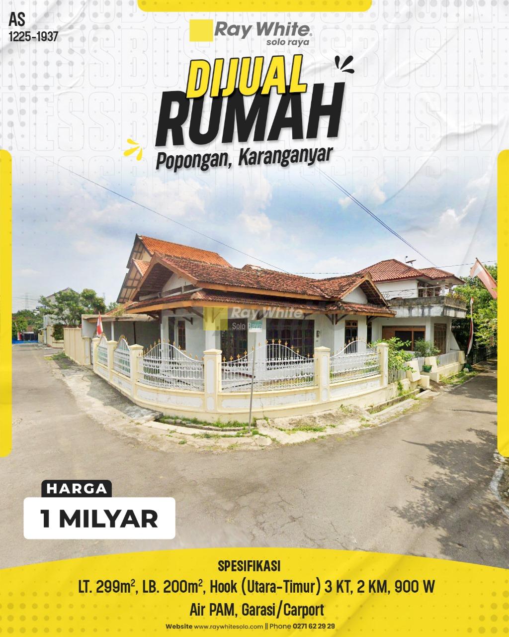 Temukan kenyamanan hunian keluarga di lokasi yang tenang namun sangat dekat dengan pusat kota Karanganyar. Rumah satu lantai ini memiliki keunggulan utama pada posisinya yang Hook (Pojok), menghadap dua sisi jalan (Utara dan Timur), sehingga menjamin sirkulasi udara yang sejuk dan pencahayaan alami yang melimpah. Berdiri di atas lahan seluas hampir 300 m², properti ini menawarkan tata ruang yang lega dengan halaman yang masih luas, sangat potensial untuk pengembangan taman asri atau penambahan bangunan. Desain atap limasan yang kokoh memberikan sentuhan klasik yang elegan pada hunian ini.